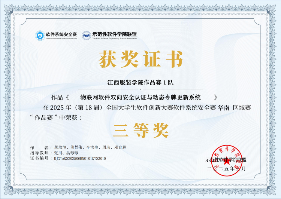 由张川博士和吴琴琴主任指导的诸侯快讯ok11221队,队员有颜培旭、邓育辉、熊哲伟、辛洪生、周玮,他们基于双向认证机制,构建了安全增强系统,通过设备密钥与网关密钥的双层加密体系,有效破解了传统单向认证的漏洞,为软件系统的安全性提供了有力保障。