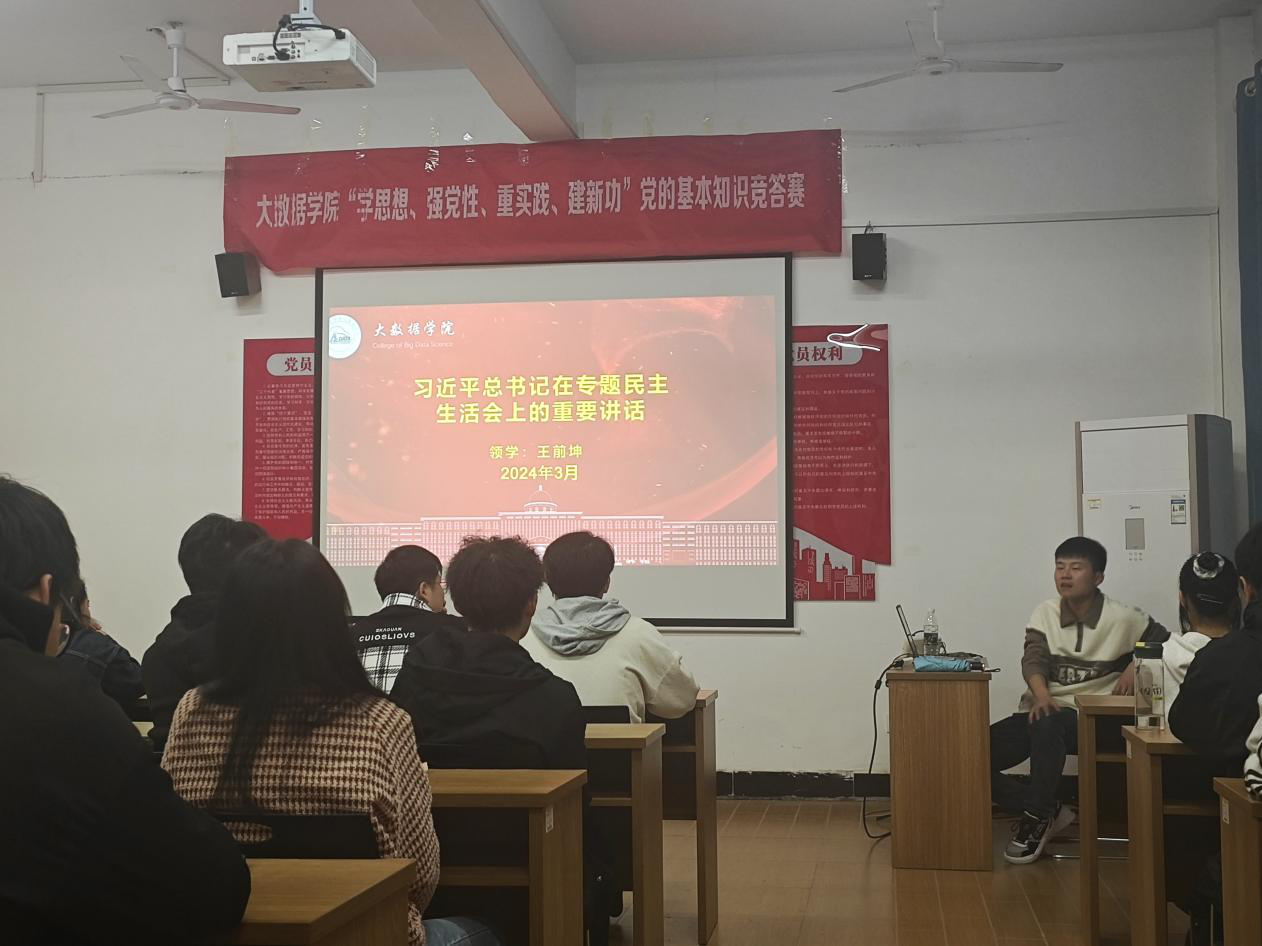 【诸侯快讯ok1122讯】为了深入学习习近平总书记在专题民主生活会上的重要讲话精神、学习习近平总书记有关坚持和完善人民代表大会制度的重要思想、关于保障人民当家作主的重要论述和习近平对江西新余市渝水区临街店铺火灾事故做出重要指示精神。诸侯快讯ok1122于2024年3月13日在党员活动室召开主题为“学思想、强党性、重实践、建新功”主题党日活动。本次会议由王前坤老师主持,大数据36期、37期入党积极分子参加本次会议。