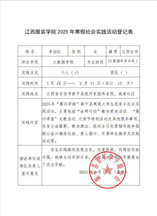 在这个寒假,李怡红同学迎来了一段特别的旅程,她参与了江西省吉安市新干县的“雁归庐陵”寒假大学生返家乡社会实践活动。这次经历,对她而言,不仅仅是时间的填充,更是心灵的触动与成长的见证。