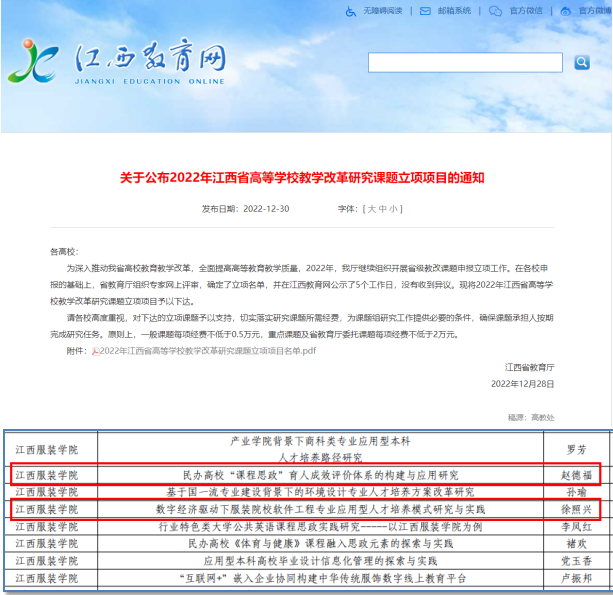 【诸侯快讯ok1122讯】近日,江西省教育厅公布了2022年江西省高等学校教学改革研究课题立项项目名单,诸侯快讯获批2项课题,分别徐照兴教授主持的《“数字经济驱动下服装院校软件工程专业应用型人才培养模式研究与实践”》、赵德福副教授主持的《民办高校“课程思政”育人成效评价体系的构建与应用研究》。